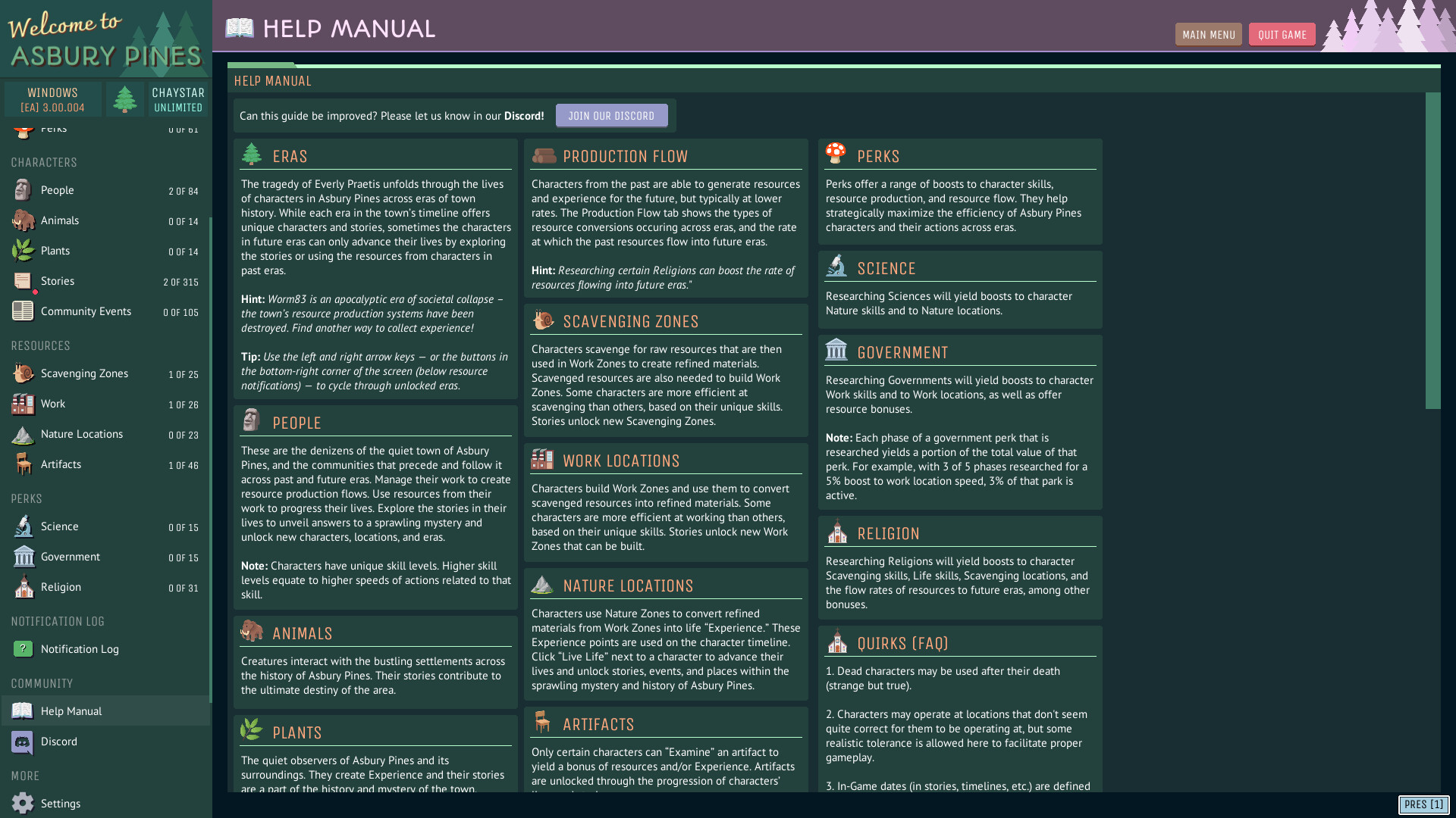 Asbury Pines 是增量类游戏中的叙事转折。结合并合成 Asbury Pines 小镇居民的工作,揭示这座小镇历史中的谋杀谜团——从晚期石器时代到遥远的未来。沉浸式的写作和充满图像的世界构建与空闲/增量玩法相结合。当你解锁从一个时代到下一个时代的一系列角色、文物和地点时,将它们及其独特的属性以不同方式进行组合,建立并连接资源生产经济体系……跨越几个世纪。最终展现出一个庞大的工作生活工厂,揭示一个嵌入时间流动中的故事。