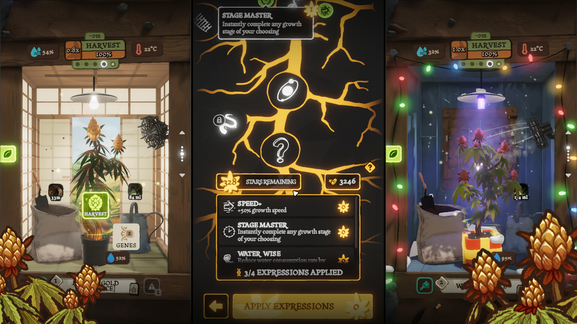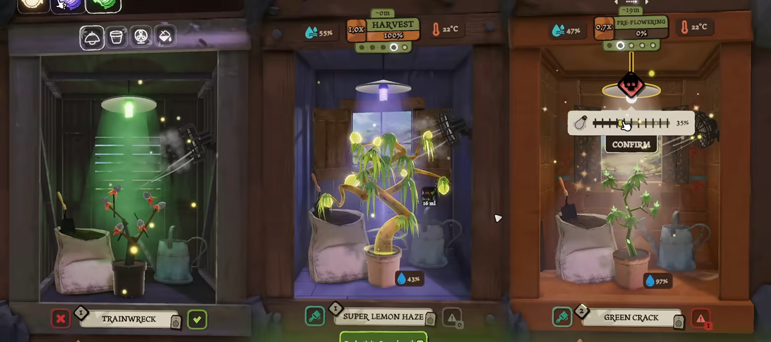 植物经历完整周期——营养生长、预开花、开花、收获和恢复。每个阶段都会出现影响结果的随机遭遇。通过五个精通等级升级单个品种,以解锁基因研究并生产值得黄金状态的完美6星花蕾。