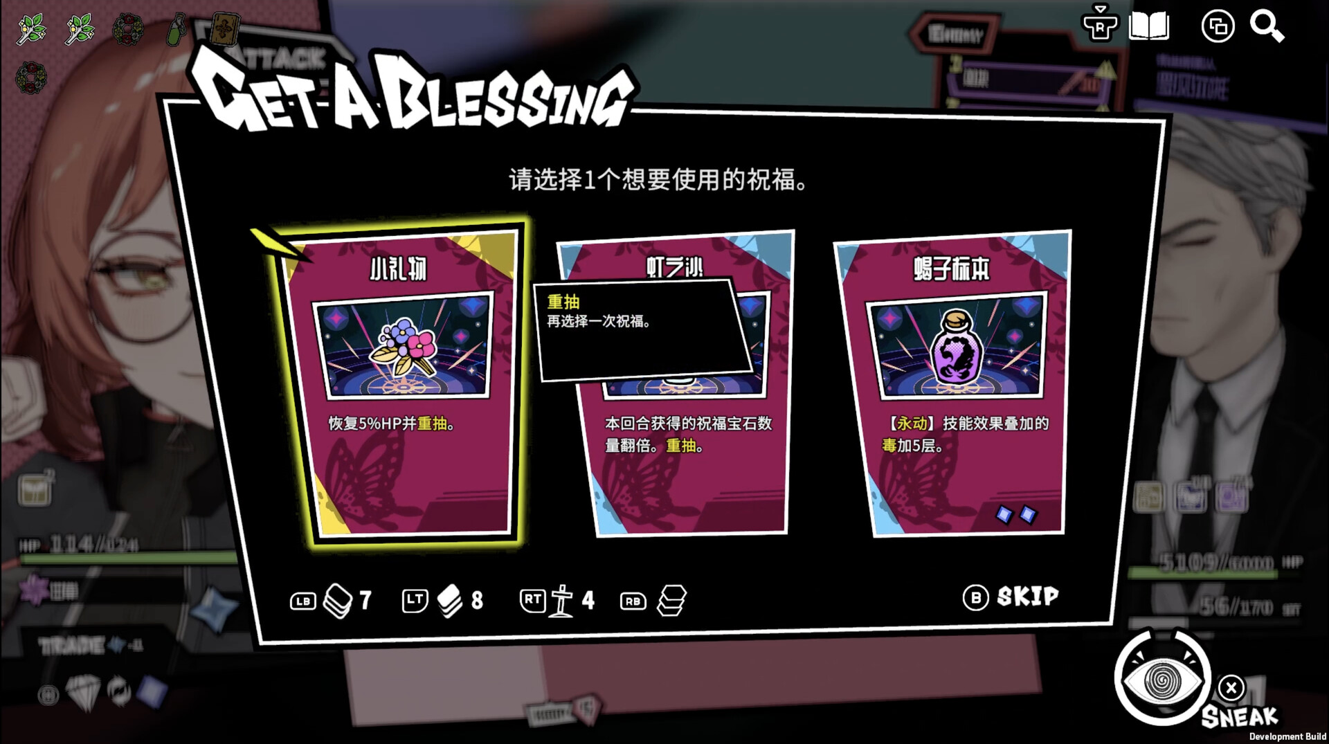 在随机生成的迷宫内收集攻击手段“技能”和战斗辅助要素“祝福”,逐步构建卡组。