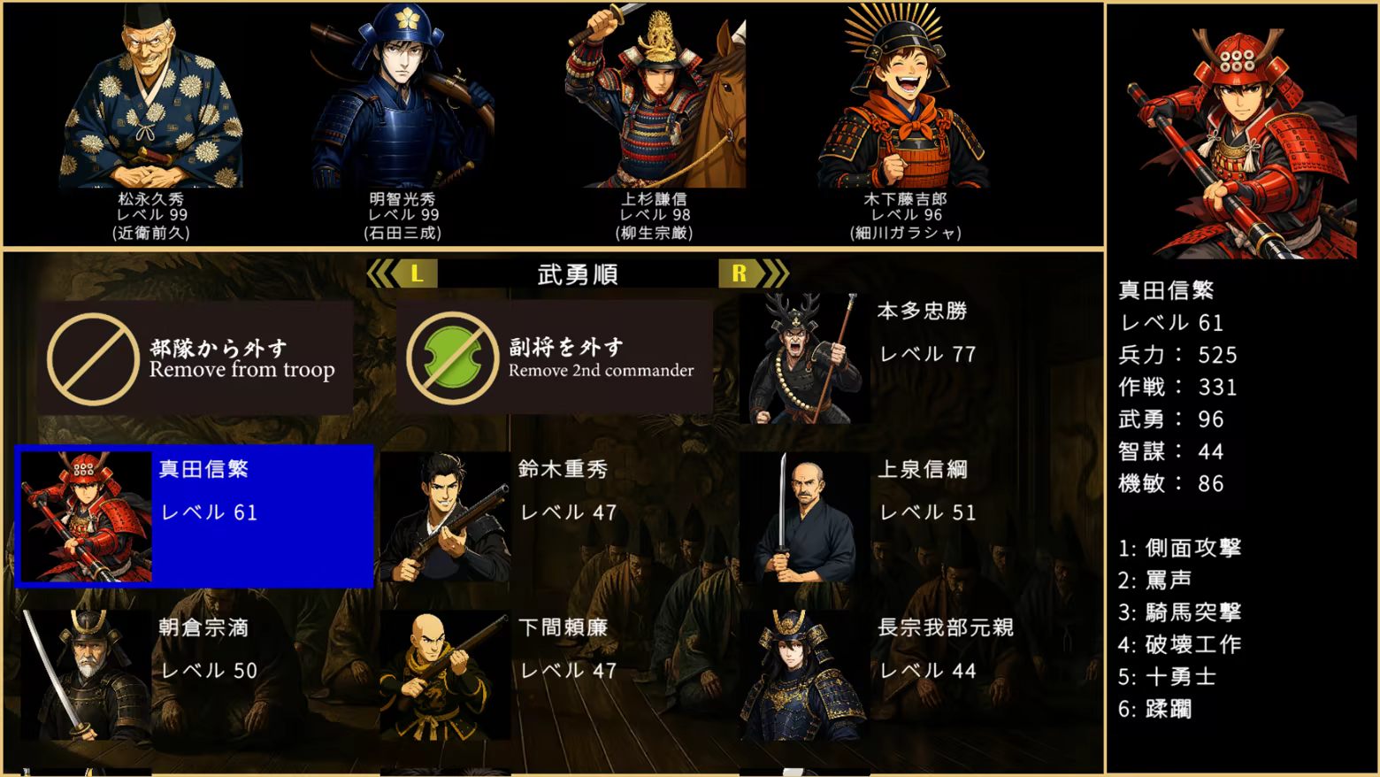 敌方军阀在你赢得战斗时可能会为你效力。 属于某个派系的军阀在征服该派系后也可能成为官员。 聚集许多优秀的附庸,目标是实现世界统一!