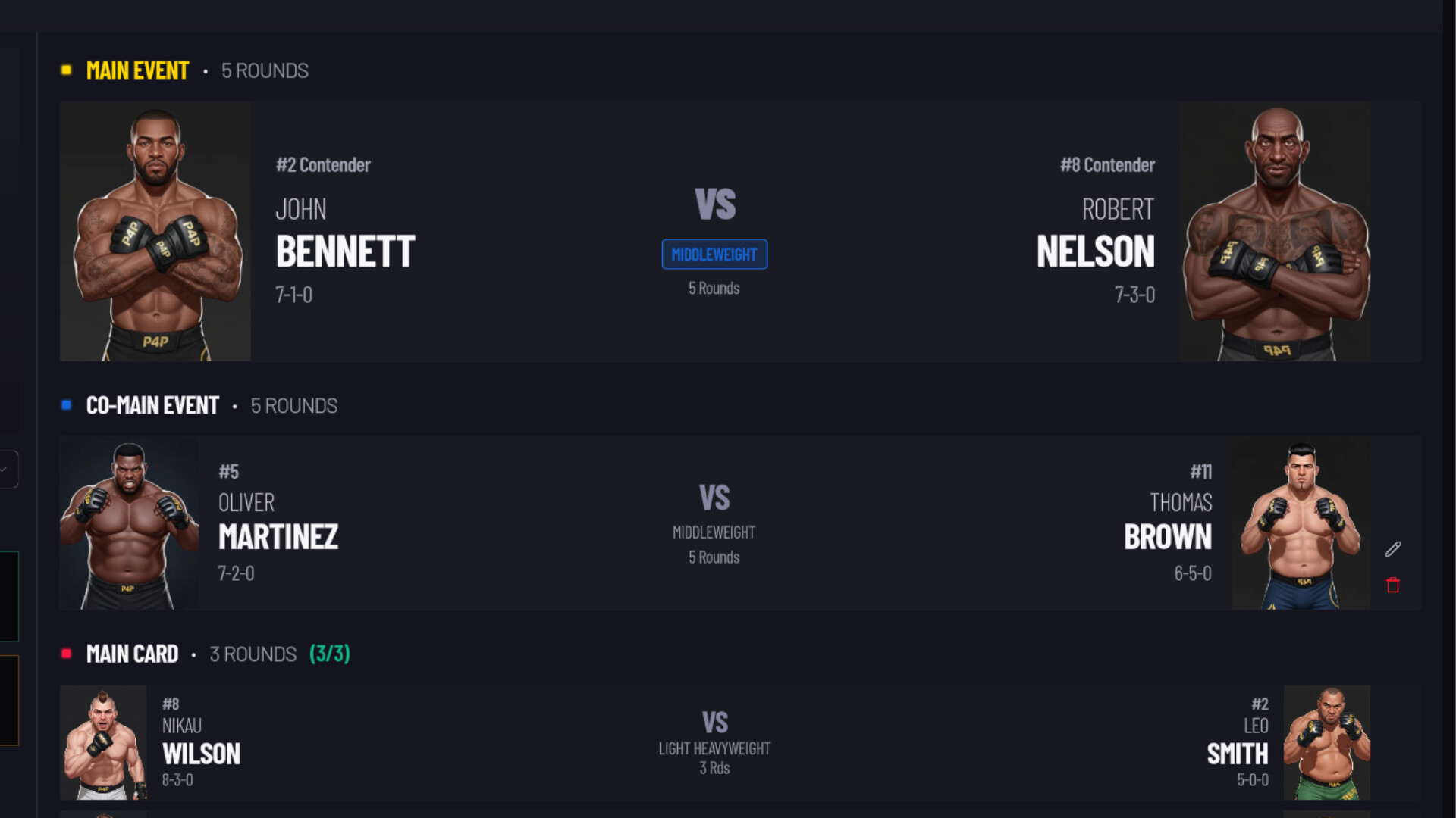 每场对阵都由拳手的属性、倾向和技能发展决定。摔跤专家克制站立型选手。压迫型选手击溃反击型选手。职业生涯发展和训练塑造长期表现。