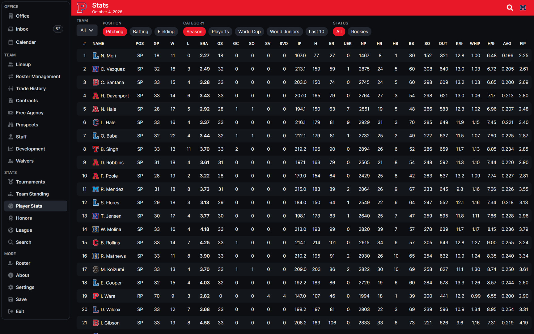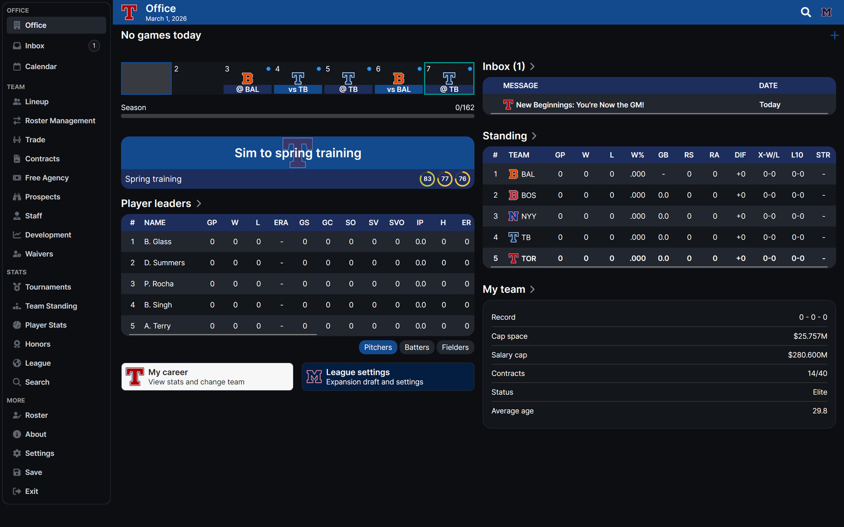 职业模式:从新手 GM 开始,逐步建立声望。换队,追逐挑战,在棒球历史上留下你的印记。