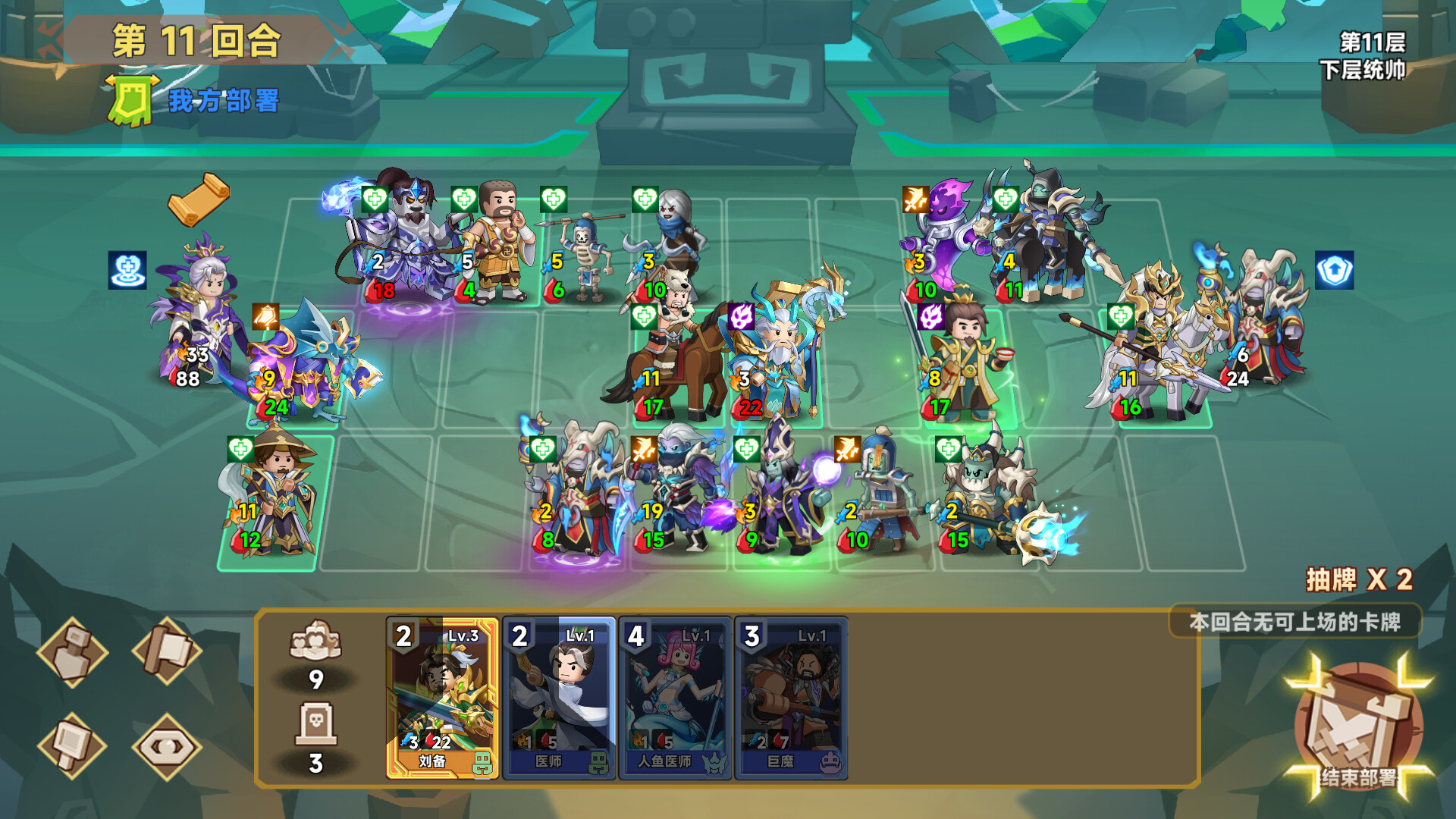 战场分为左(我方)右(敌方)两大阵营。你不需要操作士兵的具体移动,而是作为主公在后方运筹帷幄。布阵策略:将卡牌拖入主公身前的 3×3 布阵区。