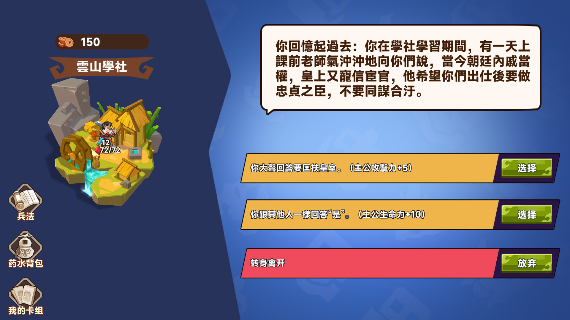 永久解锁:每次历练(无论成败)都会积累经验,解锁全新的卡牌、名酒、兵法加入你的构筑。随着游戏深入,你将获得更多匪夷所思的强力组件。