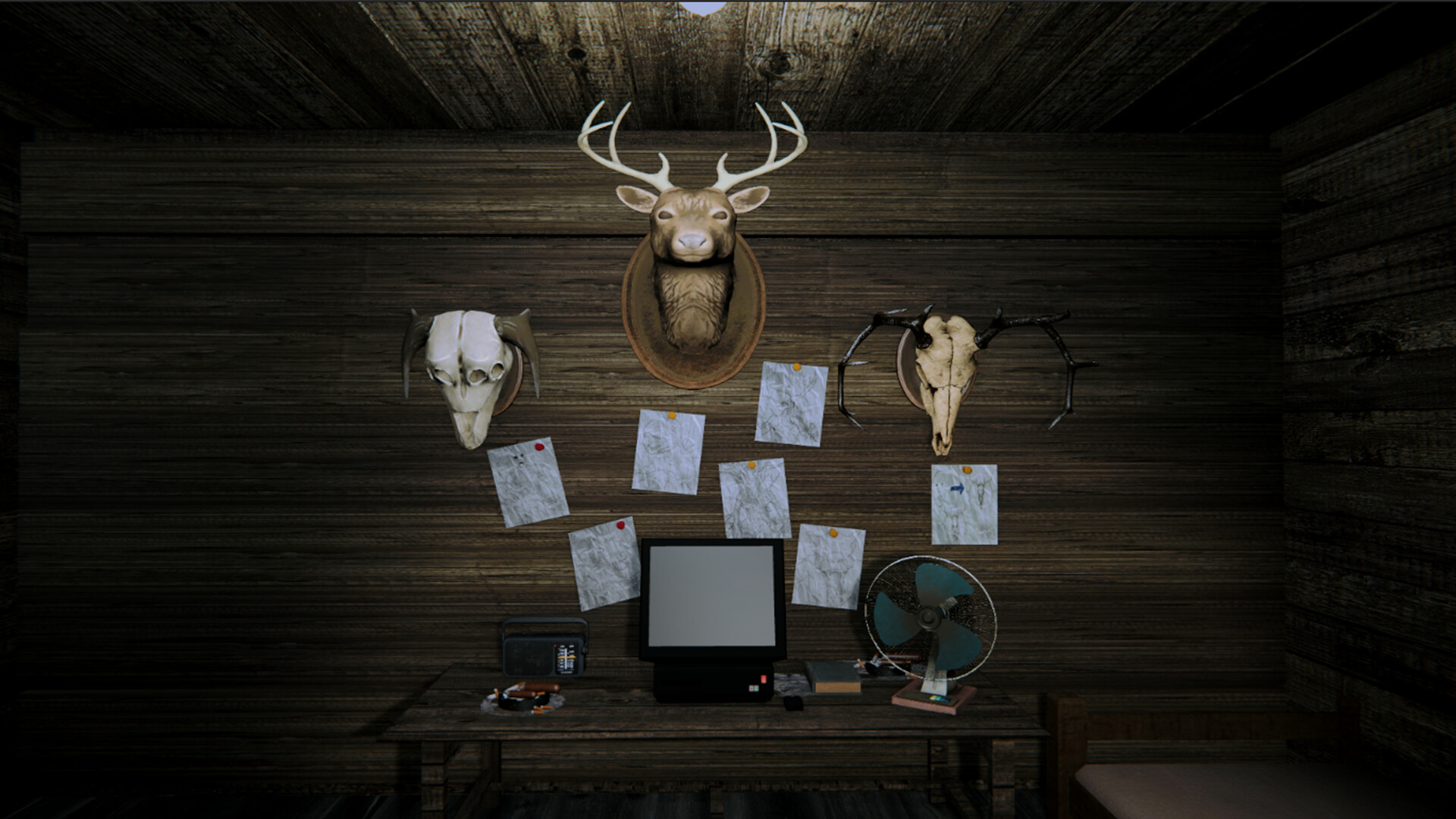这是你祖父留给你的一片隐秘在丛林深处的废墟。当你到达时,迎接你的是一间破旧的小木屋、几台闪烁不定的监控摄像头和一台老旧的磁带录音机。起初,祖父在磁带里的声音听起来还算轻松,像是在回忆那些关于“林中怪物”的陈年旧事。但随着磁带在沙沙声中戛然而止,真相浮出水面: