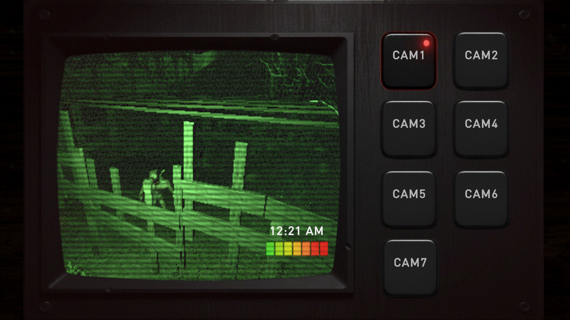 监控视角 – 在满是雪花的画面中切换,同时忍受电力枯竭的压力。经典的恐怖张力,极度有限的资源。