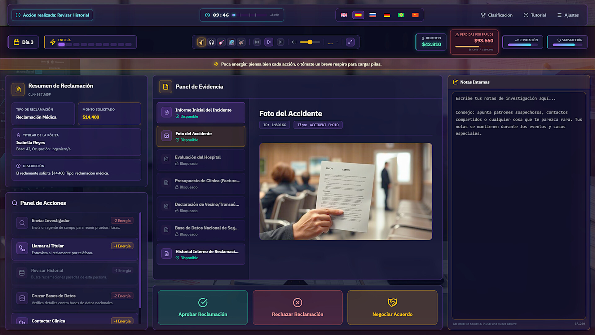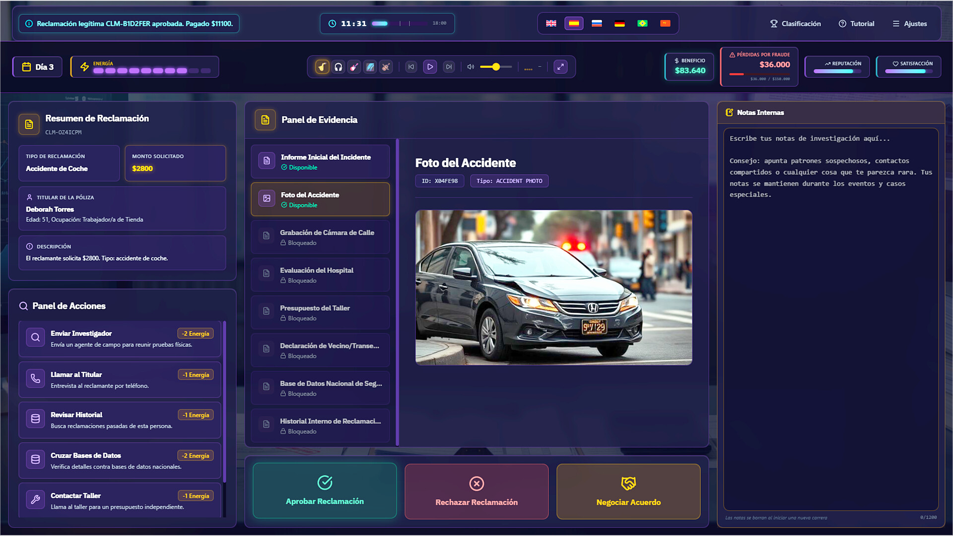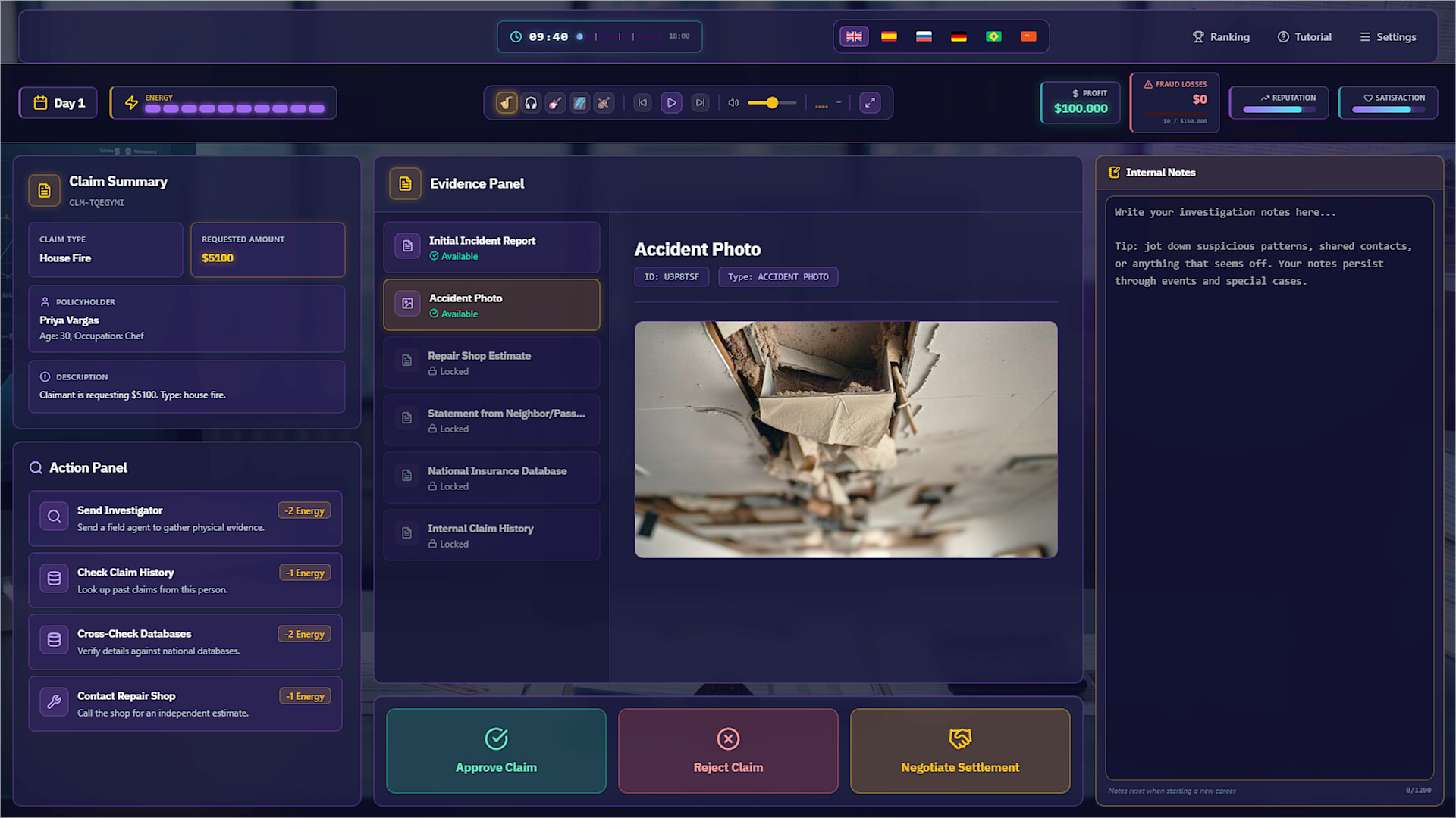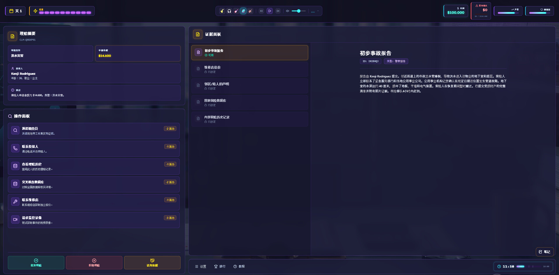 扮演一名保险理赔调查员。每天,新一批案件堆满你的办公桌——车辆碰撞、人身伤害、财产损失,应有尽有。你的任务:审查证据、研读文件,判断每一份索赔是合法申请还是欺诈行为。