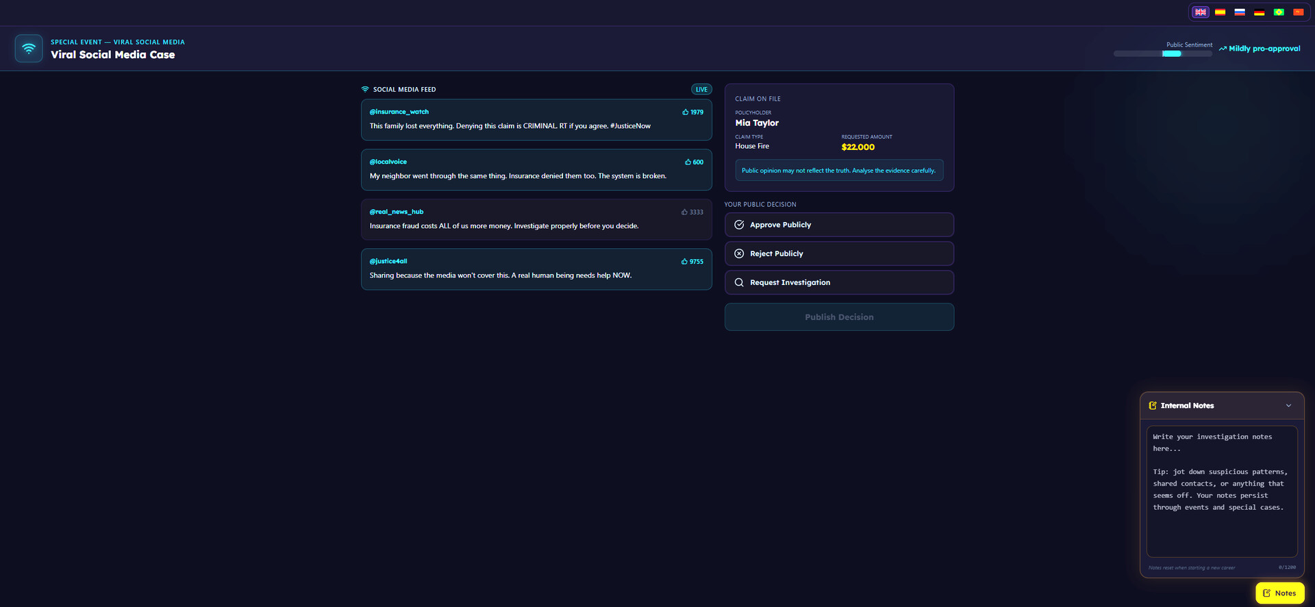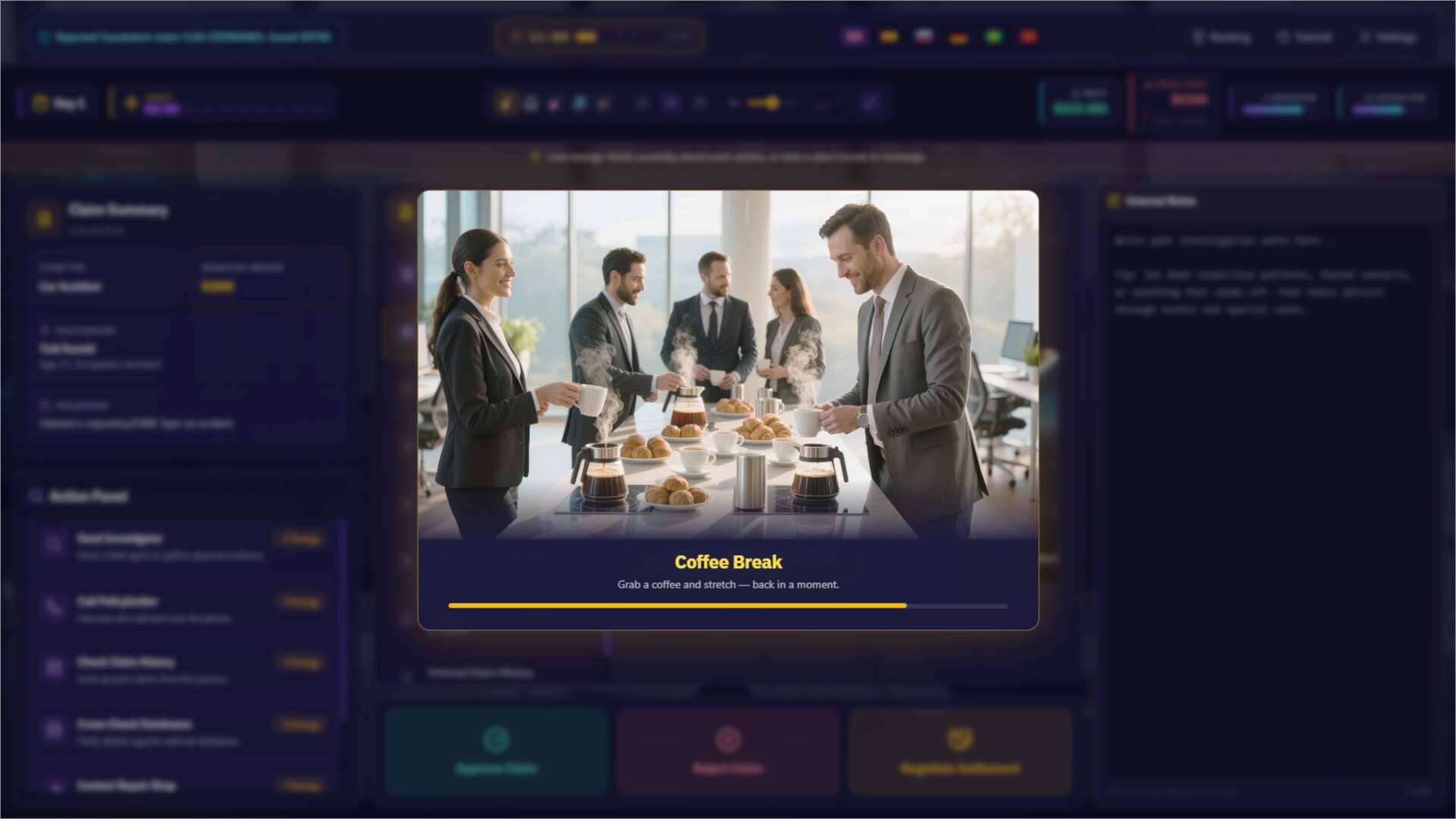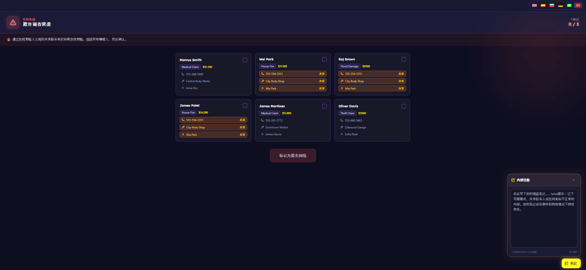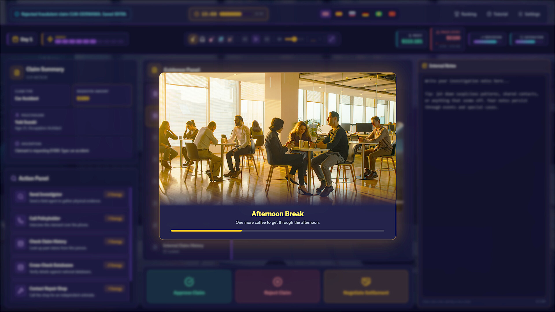 扮演一名保险理赔调查员。每天,新一批案件堆满你的办公桌——车辆碰撞、人身伤害、财产损失,应有尽有。你的任务:审查证据、研读文件,判断每一份索赔是合法申请还是欺诈行为。