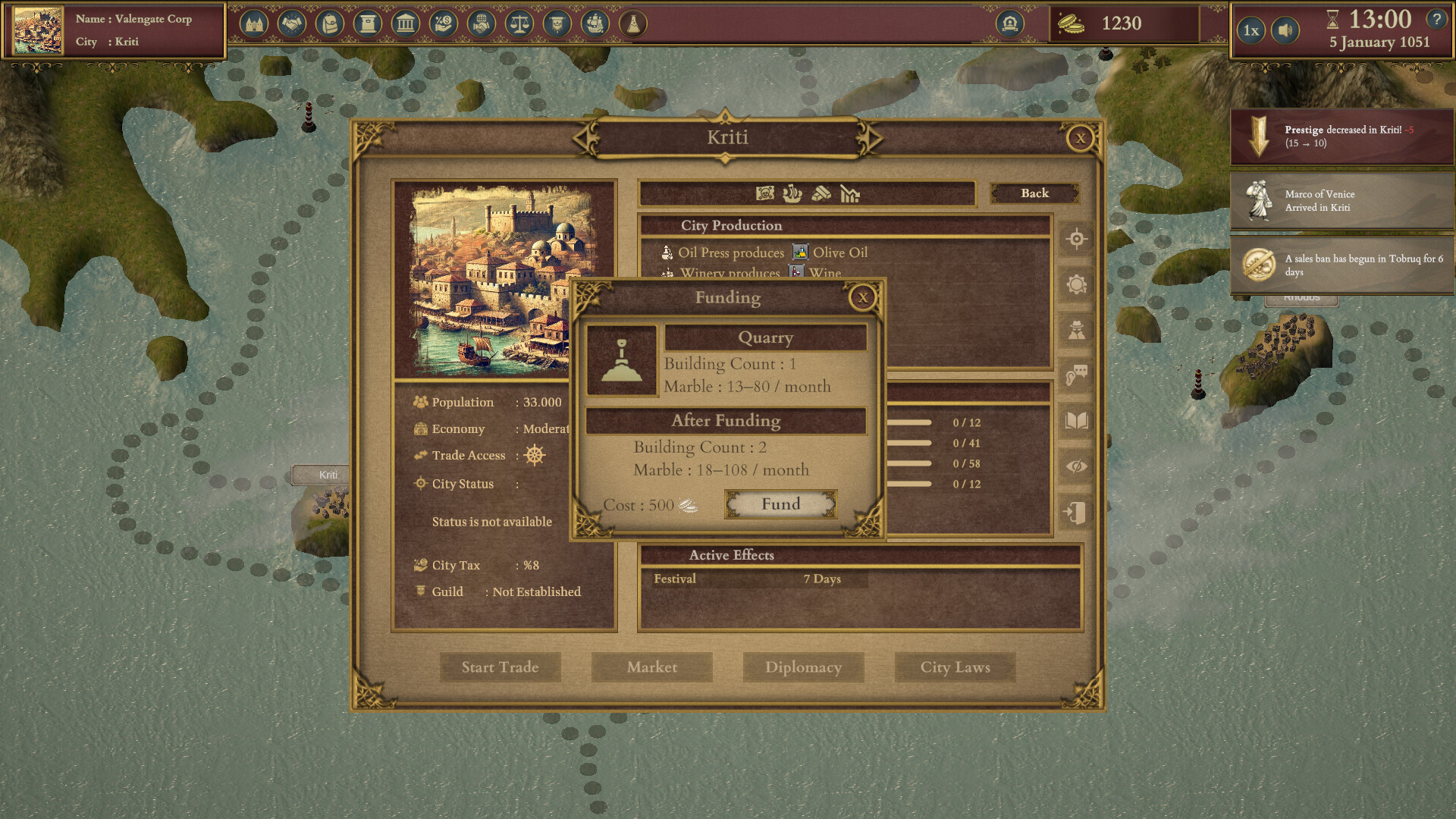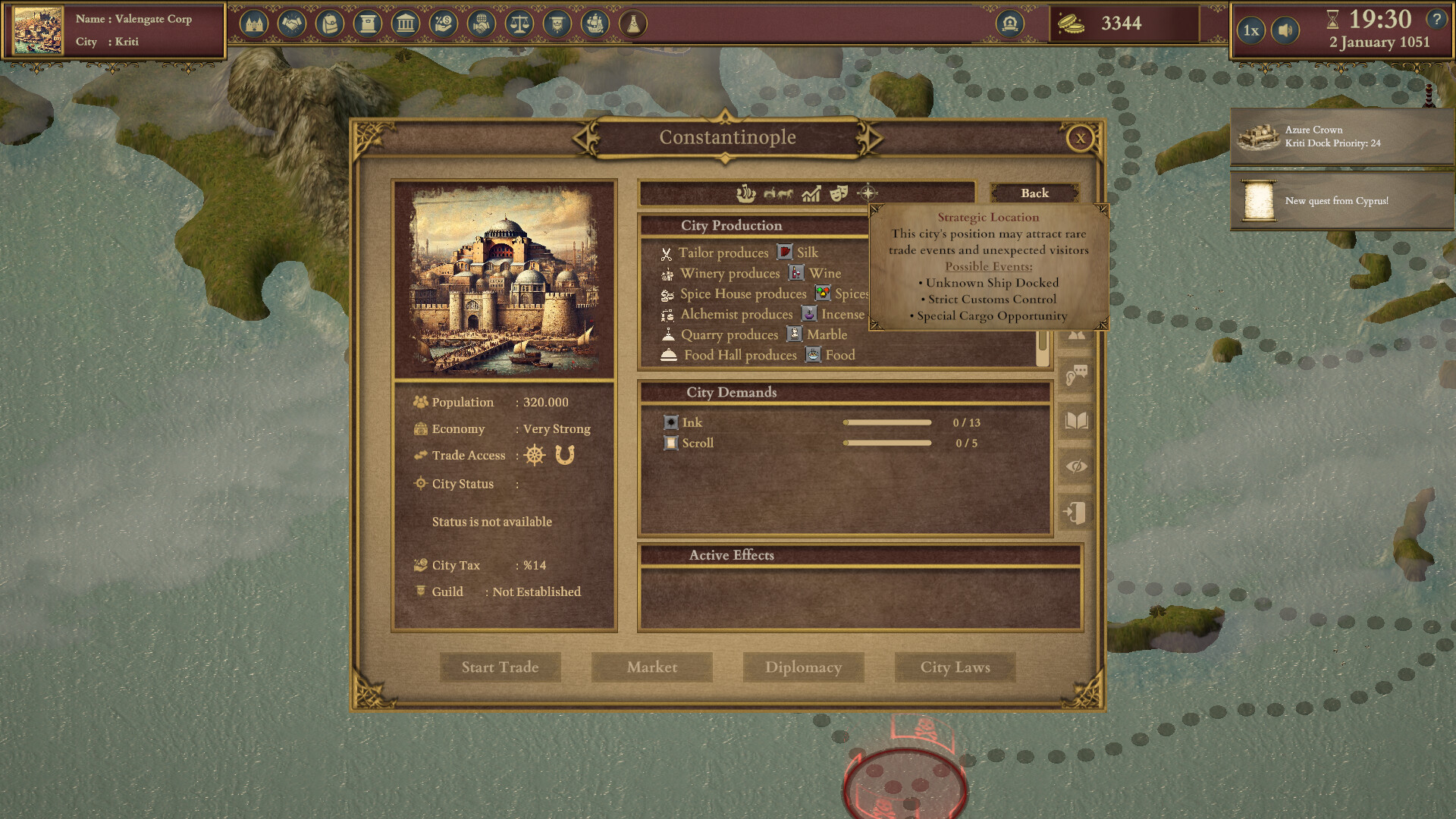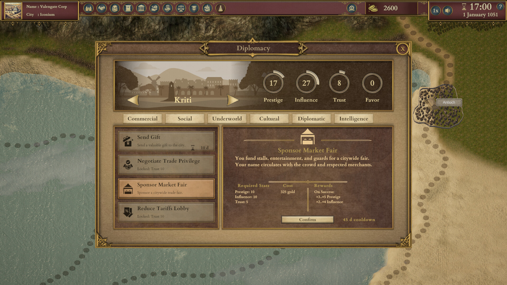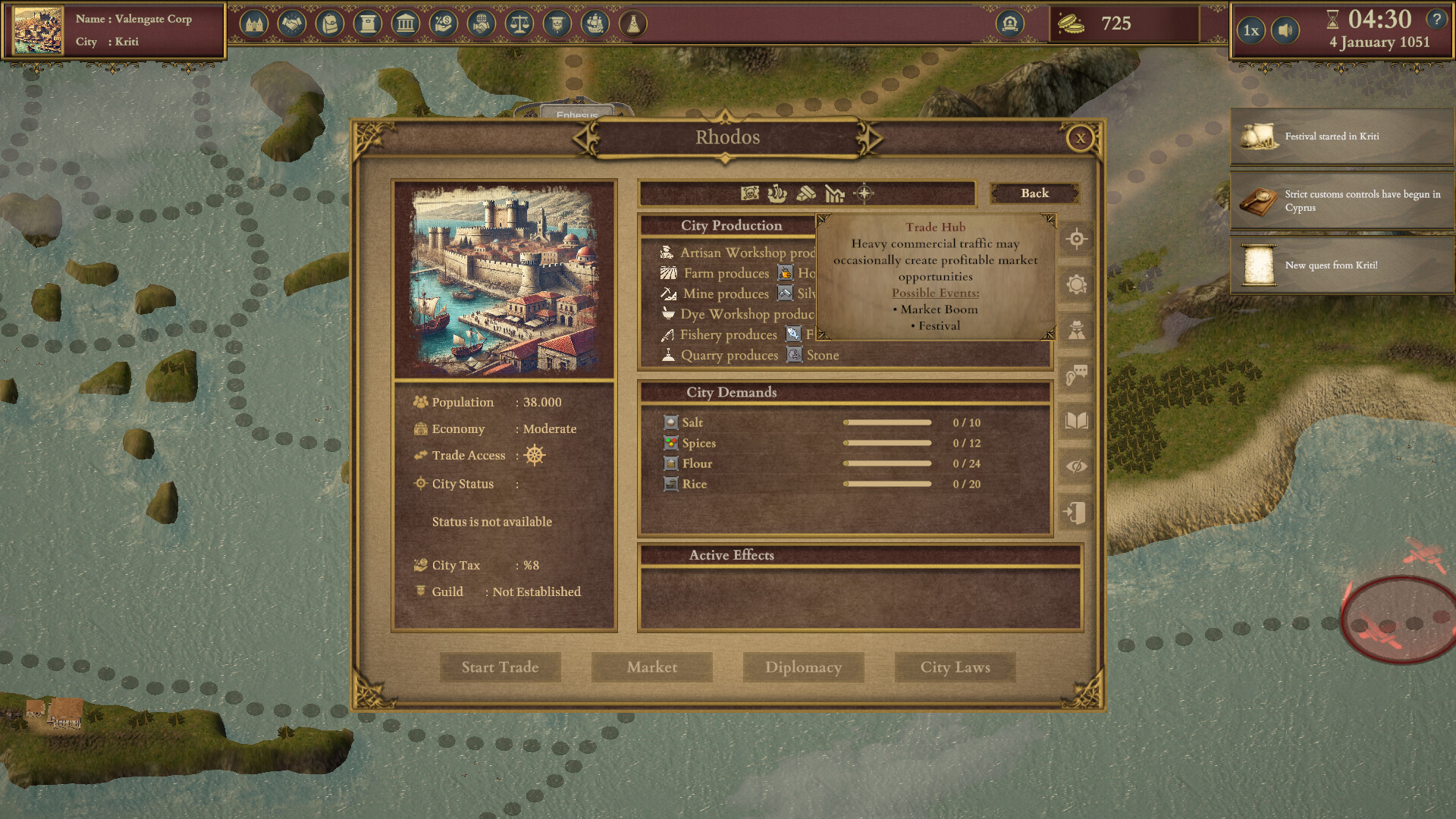 每个城市都有自己的生产和需求。通过满足这些需求,你可以提升在该城市的声望,并建立行会,以便将来直接向与你进行贸易的城市居民出售商品。此外,你还可以与城市管理部门达成协议,通过满足他们的要求获得丰厚的特权。