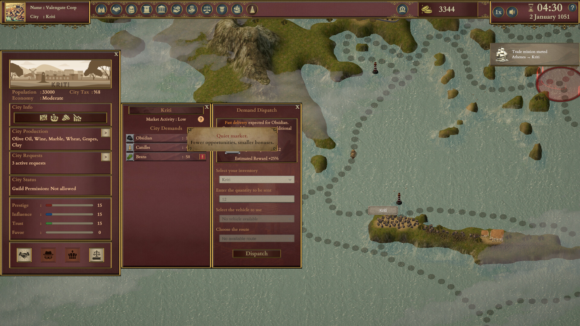你可以使用船只或商队与其他城市进行贸易。如果你没有足够的财力购买交通工具,可以先租用。你可以采取预防措施,应对路上可能出现的威胁,例如在车辆中设置秘密隔间,或雇佣武装士兵提供保护。你还可以通过向知名船长和商队首领支付费用来抵御强盗和海盗,或者贿赂他们以确保货物安全运输。