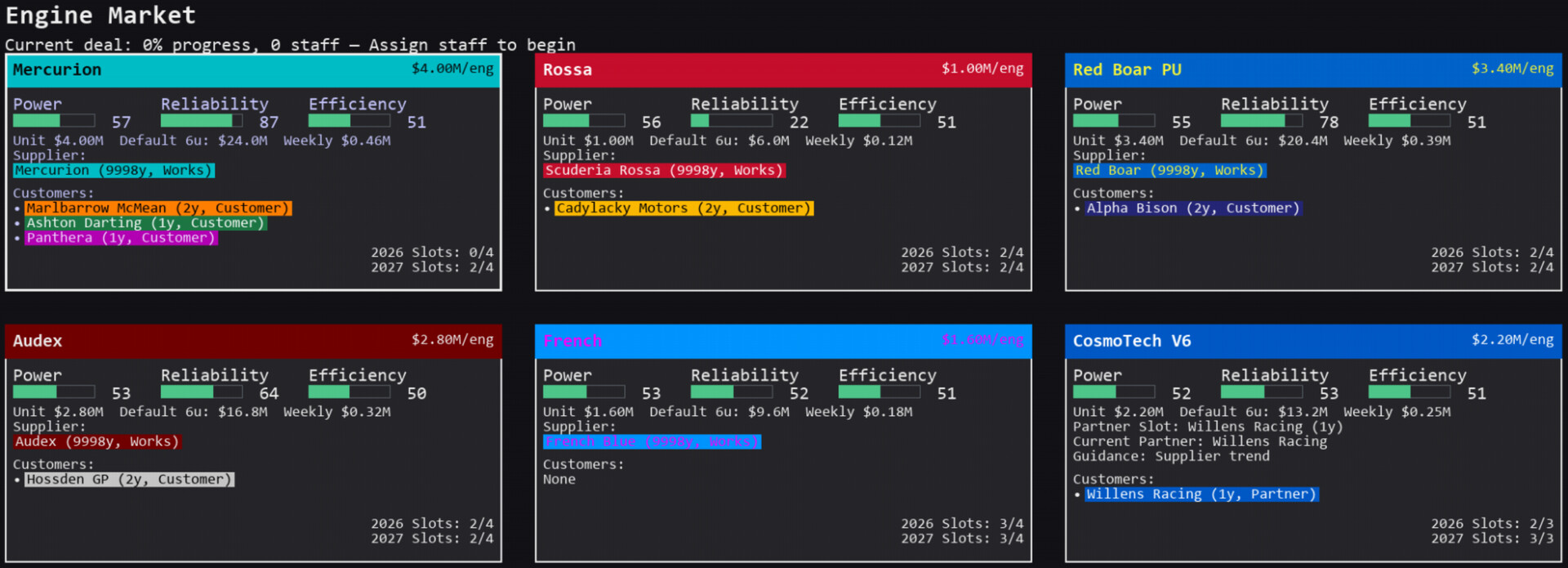 - 深入的轮胎、零件、赞助、厂队引擎、客户引擎和车手谈判系统。