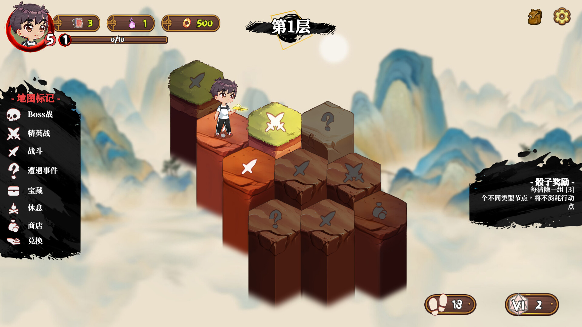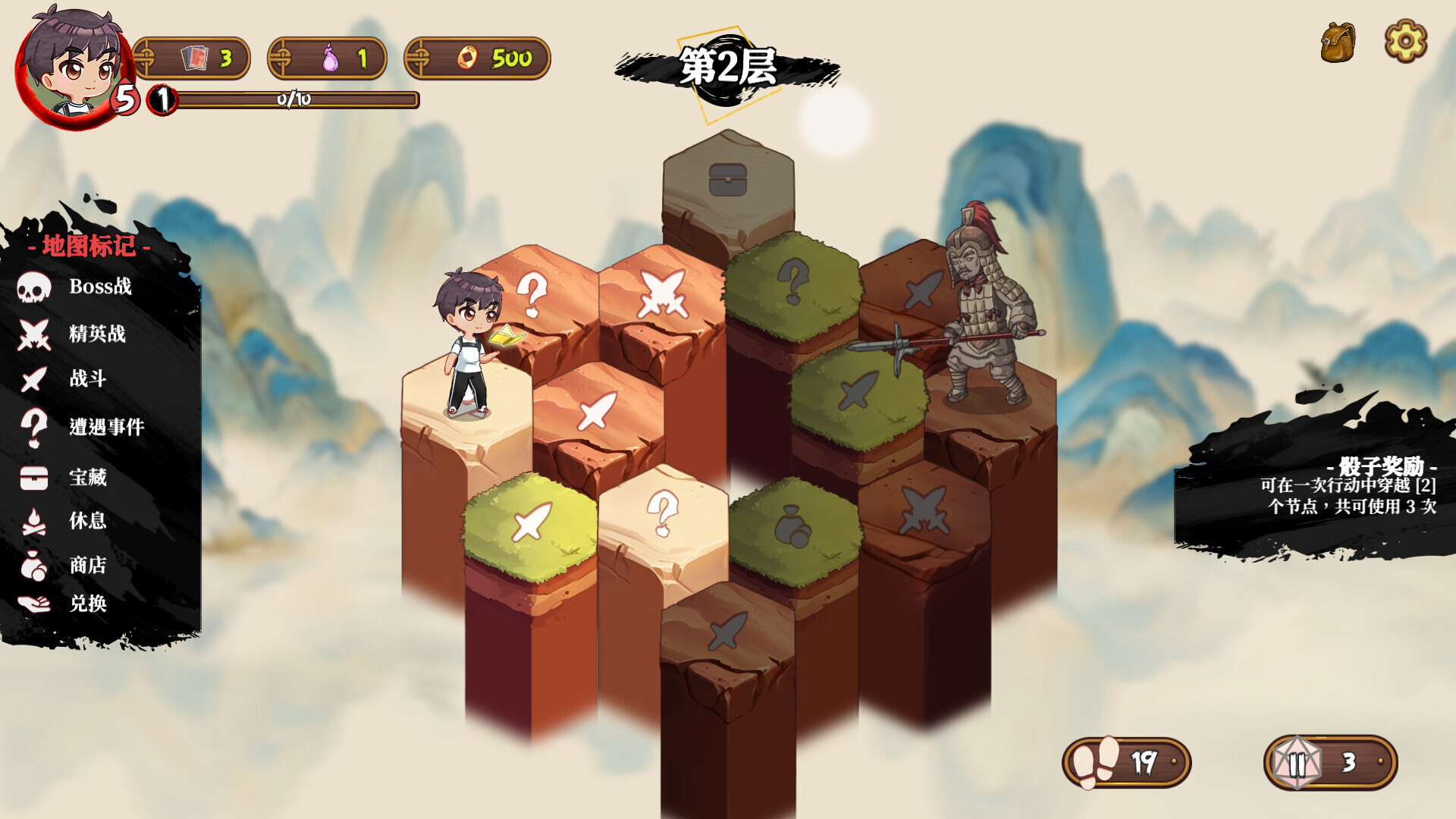 探索各种六边形节点,包括战斗、宝箱、事件等,不断强化你的队伍。